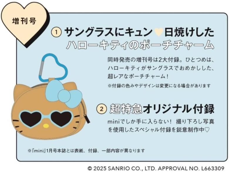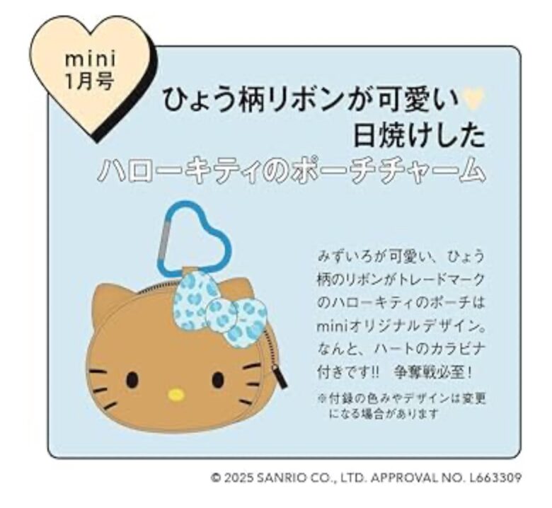 付録は、ひょう柄リボンが可愛い!日焼けしたハローキティのポーチチャーム。みずいろが可愛い、ひょう柄のリボンがトレンドマークのハローキティのポーチはminiオリジナルデザイン。なんと、ハートのカラビナ付きです!!