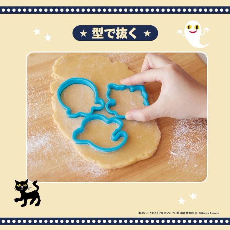 クッキー生地に押し当てて型を抜いたり、ごはんを押し詰めておばけ弁当を作ったり。クッキーもサンドイッチも、型を抜いてスタンプを押し当てれば物語のせかいに大変身。